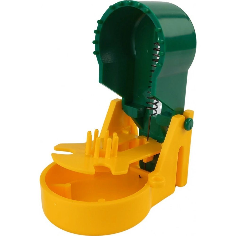 A sárga csalitálca teljesen elkülönül a rugó mechanizmustól. A befogott egeret egyetlen mozdulattal – a felső kar lenyomásával – lehet a kukába ejteni, így a felhasználónak nem kell az állathoz érnie. Ez a kialakítás sokkal tisztább és emberbarátibb.