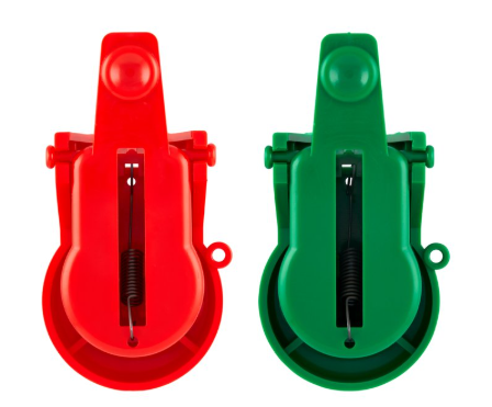 A felső színes kart hátrahajtva a rugó feszül, majd a szerkezet kattanással rögzül. A csapda most már készen áll.
